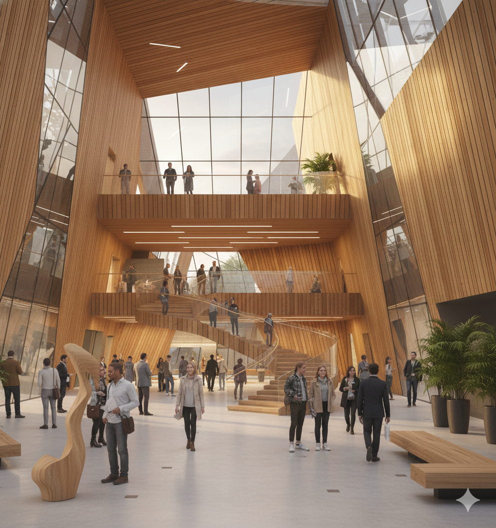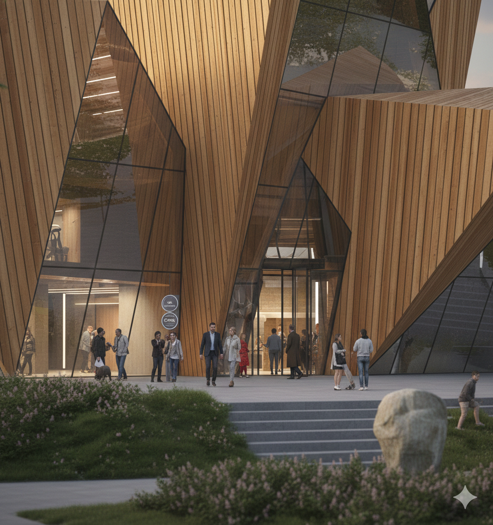 Rendered in Nano Banana, the interior continues the timber theme, creating a warm, acoustic environment suitable for a cultural space. The grand spiral staircase acts as the organic counterpoint to the rigid, angular shell, guiding visitors through the “splinters” of the museum.