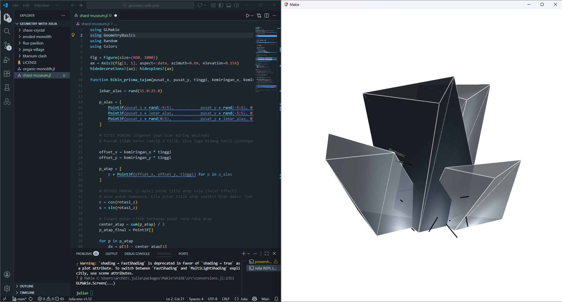 The geometry was generated using a custom function in Julia called bikin prisma tajam (create sharp prism).